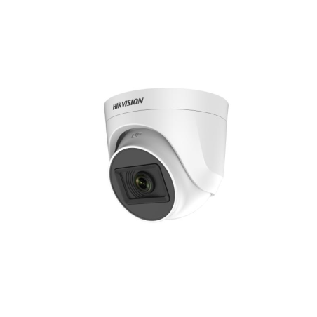 cámara de torreta fija para interiores con audio ColorVu de 2 MP. Ofrece imágenes de alta calidad con una resolución de 1920 × 1080, imágenes en color 24/7 con F1.0, tecnología 3D DNR para una reducción de ruido efectiva y un rango de iluminación de hasta 20 metros